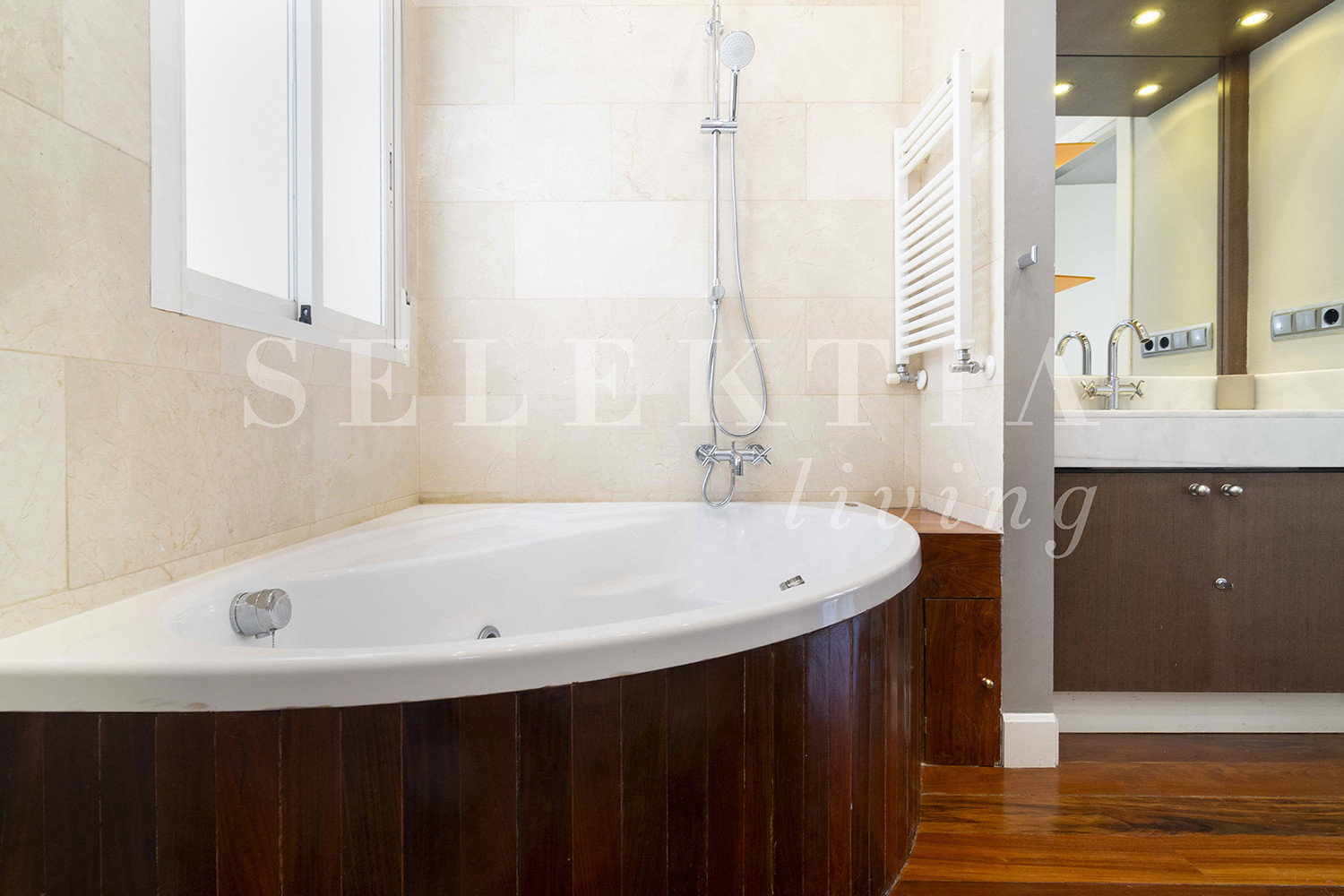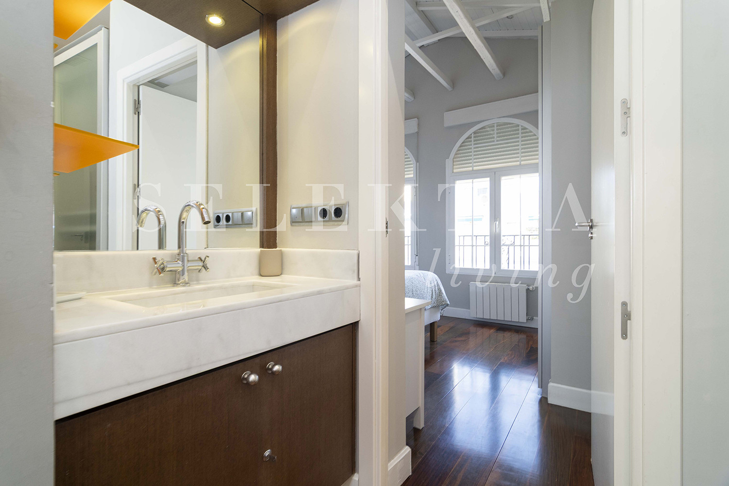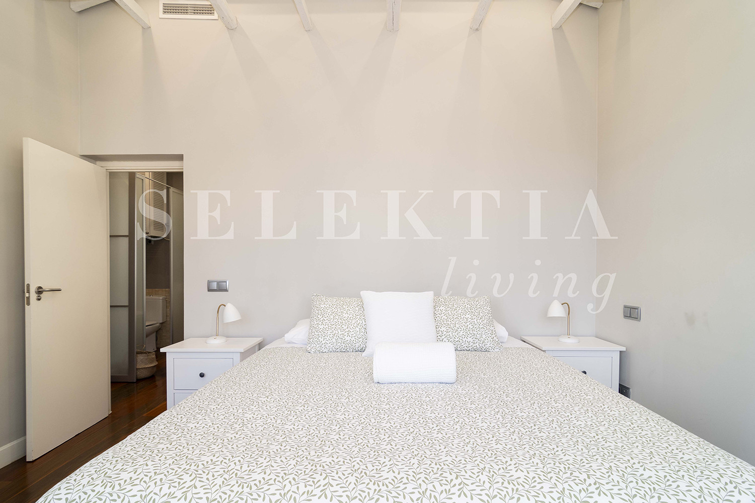 Apartamento de diseño moderno decorado en colores suaves y cálidos, totalmente equipado y con maravillosas vistas de la ciudad, ubicado en la Plaza de Colón, en un edificio exclusivo con todos los servicios disponibles para una estancia perfecta en Madrid.
