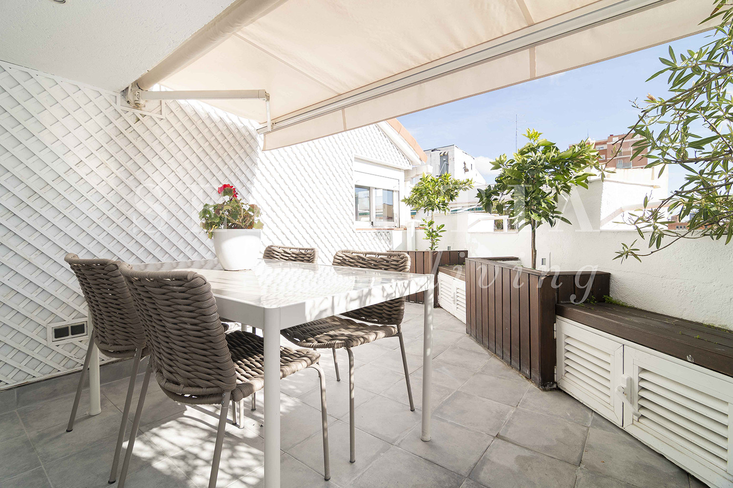 La vivienda destaca por su gran luminosidad y su espectacular terraza, ideal para disfrutar del aire libre en pleno centro de Madrid. El piso ha sido completamente reformado con materiales de alta calidad y un diseño moderno y funcional.